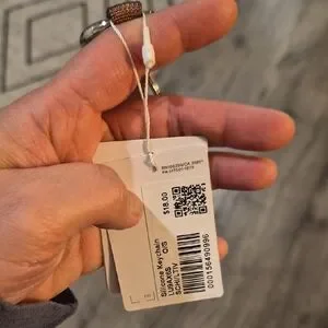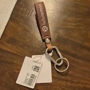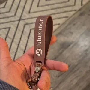 Stylish Lululemon keychain in brown with a silver carabiner. Perfect for keys or accessories.