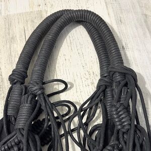 Chic black shoulder bag with intricate knotted design. Perfect for versatile styling.