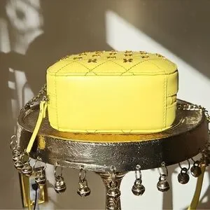 Yellow leather with Amber Swarovski Crystal embellishments, 14k Gold Plated Hardware.