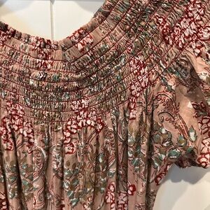 Step out in style with this elegant floral off-shoulder maxi dress. Featuring a beautiful blend of pink and green hues, it's perfect for any occasion. One size fits all.