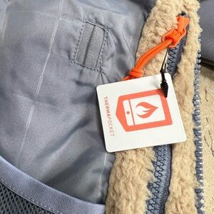 Mesh-lined sleeve vents add breathability; Media and goggle pocket and mesh dump pocket for storage; Low-bulk Sherpa fleece-lined collar provides warmth