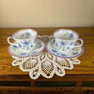 Aynsley England Teacups & Saucers Pair | Blue Floral Bone China | Vintage