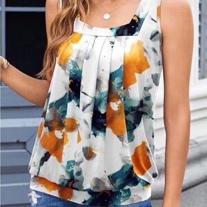 This vibrant sleeveless top features a stunning floral pattern in shades of blue, orange, and white. Perfect for adding a pop of color to your wardrobe.