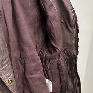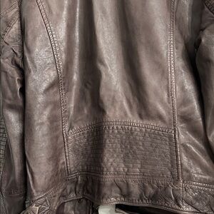 Chic leather jacket with a sleek design. Features zippered pockets and ribbed detailing on sleeves. Ideal for a stylish look.