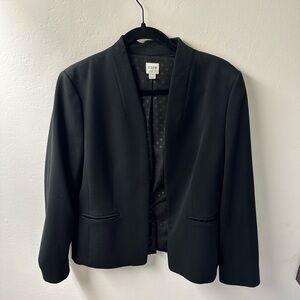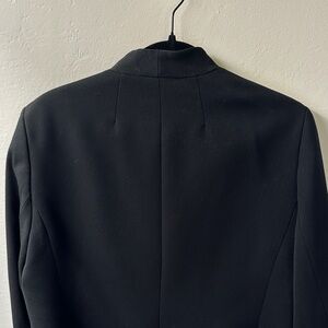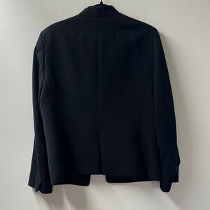 A classic black blazer from J.Crew, perfect for formal or professional settings. Features a sleek design with two front pockets and a smooth finish.