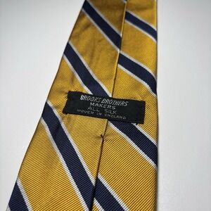 Elevate your wardrobe with this timeless Brooks Brothers Makers necktie, crafted from 100% pure silk. Featuring a striking Yellow base with Navy and White Striped Pattern, this Vintage tie adds a touch of sophistication to business attire, formal wear, or special occasions. Known for quality craftsmanship, Brooks Brothers ties are a must-have for the refined gentleman.