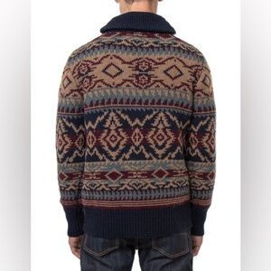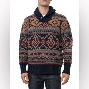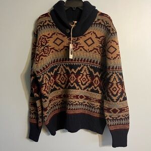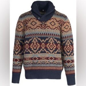 Stylish sweater with intricate patterns. Features a shawl collar. Perfect for cozy wear. New old stock .