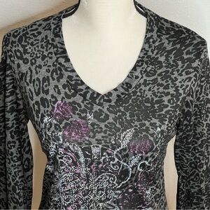 Long-sleeved V-neck gray and black leopard print rhinestone embellishments S M
