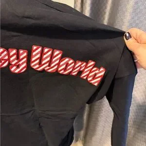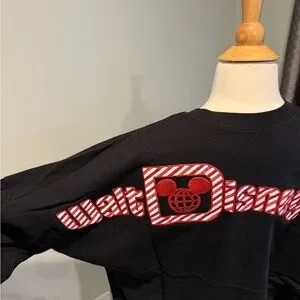 Be in the holiday spirit with this rare Walt Disney World Candy Cane Spirit Jersey. Made of comfortable cotton material, this black shirt features a crew neck and long sleeves with a regular fit. The shirt is adorned with a festive logo accent, perfect for Disney fans who love Christmas and cartoons.