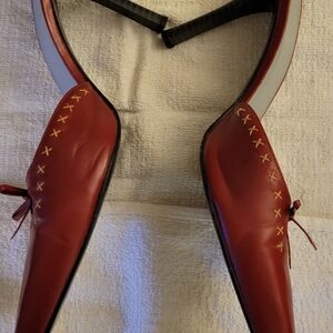 Slightly worn chic red 4.25" stacked heel mules with delicate bow accents and contrast details. These run narrow in the toe box so they were only worn a couple of times.