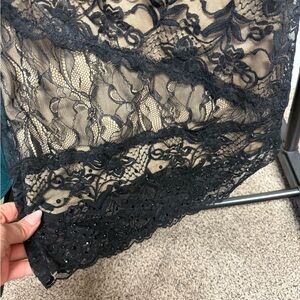 bebe Black Lace One-Shoulder Dress with embellished hems