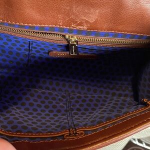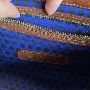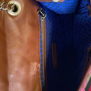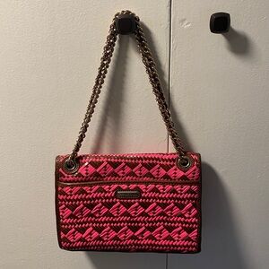 Stylish hot pink and brown woven leather shoulder bag with a chic chain strap. Perfect for adding a pop of color to any outfit. Has a woven geometric design. Wonderful early Rebecca Minkoff bag, very clean interior and exterior, hardly carried. Comes with Rebecca Minkoff dust bag. One zip pocket and two small patch pockets inside. One slip pocket on the exterior backside of bag, perfect for holding a phone. Note one small discolored mark on the interior flap of brown leather near the pocket, otherwise fantastic condition. No other marks/stains, extremely clean lining.