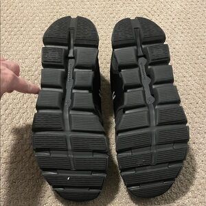 SZ 11/5 On Cloud Mens Black Sneakers almost brand new . Worn Once and in excellent condition . No original box and bought at Bloomingdales . No stains , rips or tears . Mint condition and item comes from a smoke /pet free home . Need a half size smaller for my husband . And could not return to store because they had been worn once .