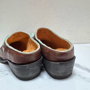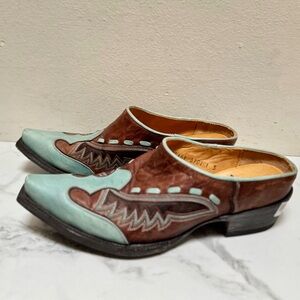 If you appreciate distinctive, well-made Western footwear, the Old Gringo Quiroga Mule in Brass Aqua offers a refined take on the style. Crafted from distressed brass leather with a turquoise overlay, it balances character and restraint. A leather-stacked heel and thoughtful construction make it as comfortable as it is polished.