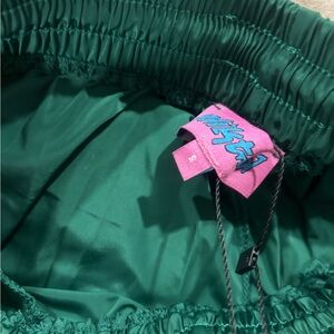 Chic green track pants with white side stripes. Ideal for casual wear or workouts. Comfortable and stylish.