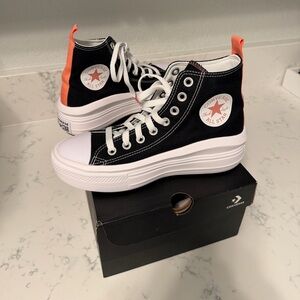 New in original box, never worn!! Black, Converse high-top sneakers with white platform soles. Features orange heel tab and classic Converse logo. Excellent, new condition!