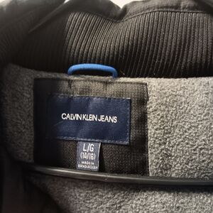 Stylish black hooded jacket with CK logo. Features front pockets. youth large 14/16 excellent condition. zipper and snap front closure. pit length 21" sleeve 18" collar down length 28"