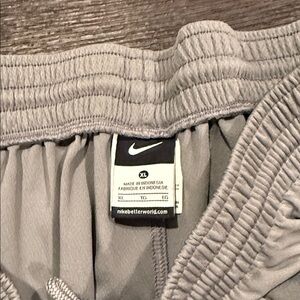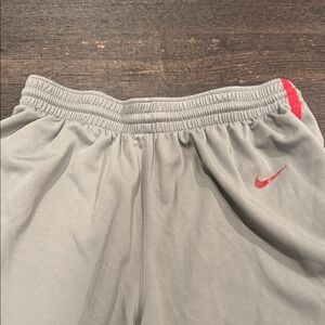 Nike athletic shorts with a gray base. Crimson and white accents for a bold look. Ideal for sports and casual wear. Vintage longer fit