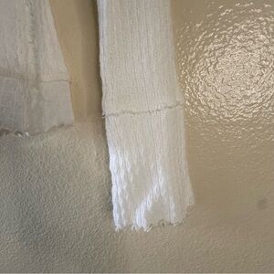 Features: Soft cotton fabrication, low scoop-neckline, slim-fitting long-sleeves, exposed seam detail, layered hem detail, lettuce-edge trim