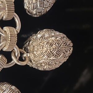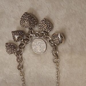 Silver necklace with puffy, thatched heart charms. Perfect for any occasion.