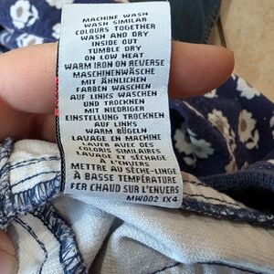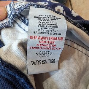 Comfortable blue pants by Mini Boden featuring daisy pattern and heart shaped back pockets.