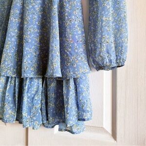 Stylish mini dress with floral design. Features a tie waist and layered skirt. Ideal for casual wear.