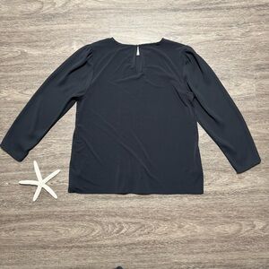Description: Lightweight unlined black blouse. Long Sleeves. Vertical pleating down front. Keyhole opening in back. Made of polyester and spandex. Machine washable.