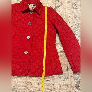 Elegant red quilted design. Features button closure. Ideal for warmth and style.