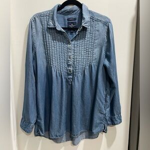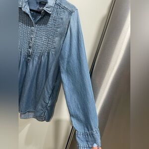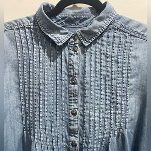Chic light blue button-down shirt. Features pintuck detailing and long sleeves. Ideal for casual wear.