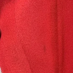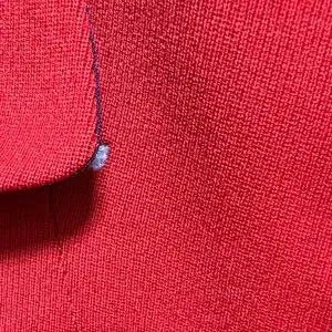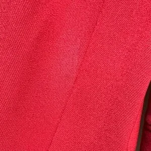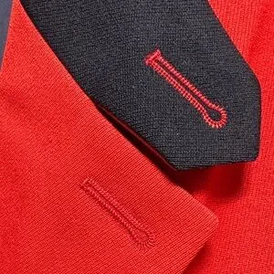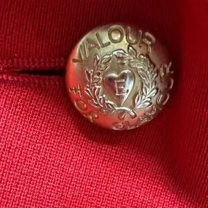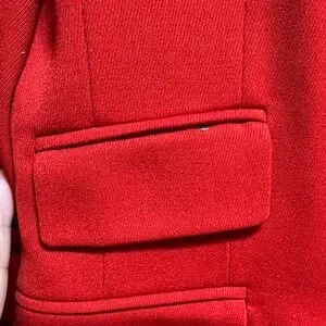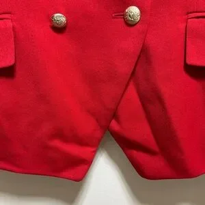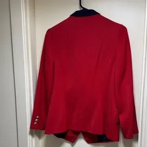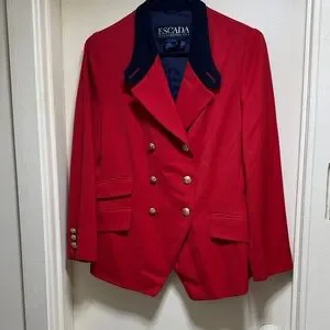 Elegant Escada blazer in vibrant scarlet. Midnight blue collar adds contrast. Gold buttons enhance the look.
