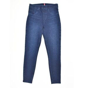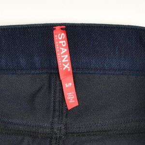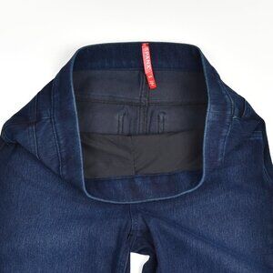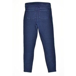 Pull on. Soft, stretch material. Faux front pockets. Back pockets. Lining in front of waist. Ankle length.