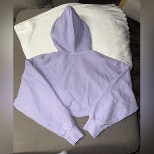 Stylish cropped hoodie. Soft lavender color. Features a drawstring hood and ribbed cuffs. there is a small stain (shown in pics) worn once size 2 womens