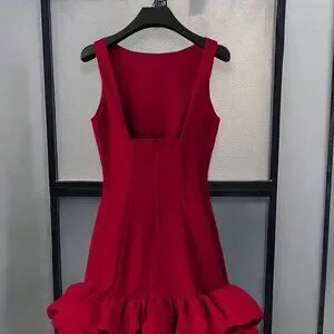 Burgundy Casual Women's Crew Neck Sleeveless Ruffled Hem Elegant Mini Dress