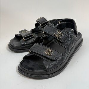 Authentic Chanel black leather sport sandals featuring quilted leather straps, adjustable Velcro closures, and gold-tone CC logo detailing. Comfortable, chic, and perfect for everyday luxury wear.