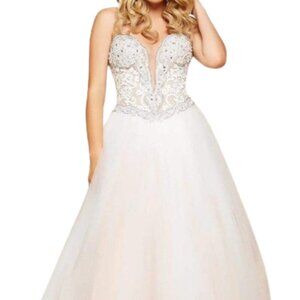 Product Details: Strapless, Crystal accents, Lace appliques, Plunging neckline, Sheer fabric, Lace up back, Ballgown skirt, 100% Polyester, Professional dry clean only