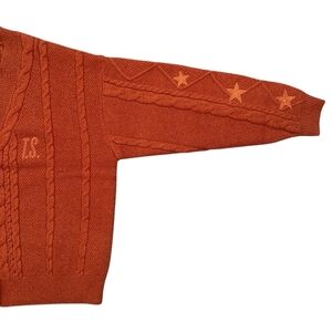 Cozy burnt orange/ rust colored cardigan with cable knit design. Features star patterns on sleeves. Button-up front with 'T.S.' initials.