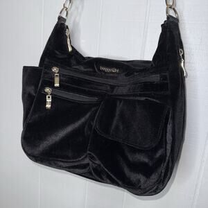 Baggallini Modern Everywhere Bag In Black Velvet With Gold Hardware.