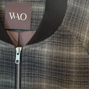 WAO bomber jacket features a plaid pattern, a front zipper closure, side slant pockets, and a ribbed neckline.