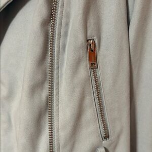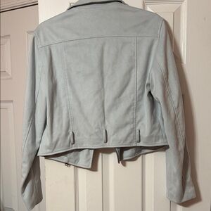 NWOT Stylish light blue suede material biker jacket with a sleek design. Features zippered pockets and a classic collar. Missing belt that was with it originally.