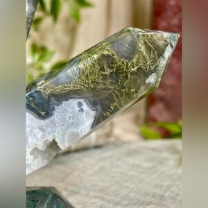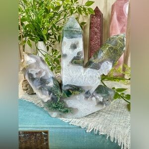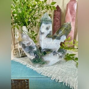 This listing is for a stunning 4 point crystal tower that showcases Moss Agate mixed with Quartz. The tower is 5 inches tall and 5 inches wide. All 4 points have a combination of gorgeous green Moss Agate intermixed with snowy white crackle Quartz. Please see all photos for close up detail.