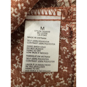 Paper Crane women’s top short sleeve tiered bottom rust and beige medium 100% polyester. Instructions say hand wash but comes out fine with machine wash on delicate cycle with cold water and hang dry.