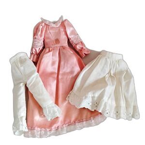 Charming antique China head doll from the Victorian era, approximately 1890s–1900s. This 12 inch doll has a glazed porcelain shoulder head with blonde molded hair, painted facial features and classic China arms and legs with brown painted boots. Stuffed cloth body. She is wearing a later handmade pink satin dress with lace collar and cuffs, along with white cotton undergarments. A lovely example of an antique German parlor doll.