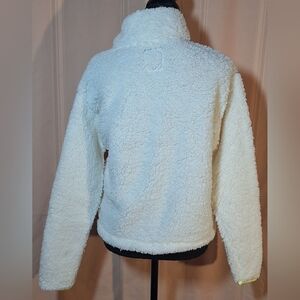 Soft sherpa jacket with neon yellow 1/4 zipper, and kangaroo pocket. Ideal for cool weather. Stylish and warm. It does have moderate pilling on the inside.