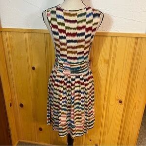 Cute pullover style sleeveless soft rayon jersey multicolored fit and flare dress. Dress has a twist waist detail. Side pockets and fully lined. In excellent worn condition. Approximate measurements laying flat: bust 13” across from armpit to armpit and length 37”.