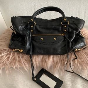 Auth S/S 2016 Balenciaga Black Gold HW City Medium Leather Bag