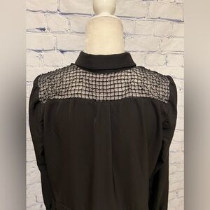 This stylish black shirt dress from Ann Taylor LOFT is a must-have for the fashionable woman. Crafted from a blend of polyester and spandex, it is comfortable and easy to wear. The dress features long sleeves, knee-length hem, and a sheath silhouette that will flatter any body shape. Additionally, it comes with pockets, making it both practical and stylish. Perfect for a range of occasions, this dress is versatile and can be dressed up or down. So whether you're going out to dinner or to work, this dress will ensure you look and feel great. Has netting in the back that is in fair condition - see pictures. Smoke free home.