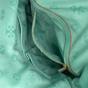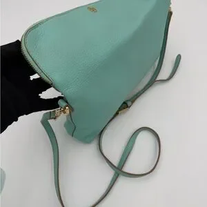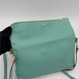 EUC Tory Burch leather crossbody or clutch in vibrant “Tiffany” turquoise. Crafted from premium leather. Removable Strap. Features gold-tone accents and hardware. Perfect for any occasion. Magnetic closure. 2 zipper compartments. Branded cloth interior. Measures: ~ 12” x 7” x 2.5”.