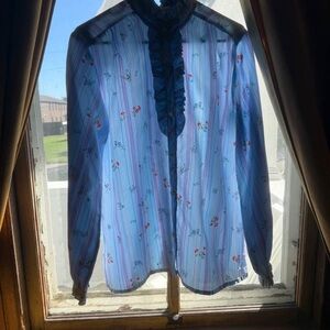 Charming blouse with colorful stripes and floral patterns. Features a ruffled neckline. Size has faded fits like a large