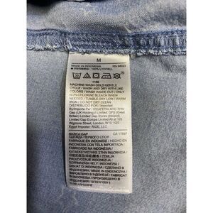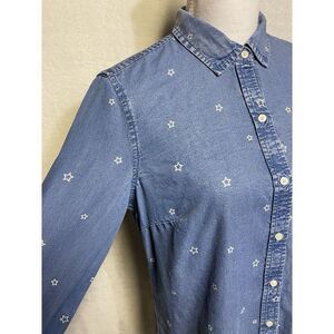 Gap medium indigo women's soft jean shirt with stars. Button closure, collar, sleeve cuff button closure, 1 pocket on chest, women's size medium. Preowned excellent condition. 100% Lyocell and machine wash inside out and Tumble dry low.