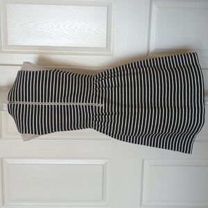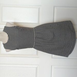 Elevate your wardrobe with this timeless black and white striped dress. Perfect for any occasion, this dress offers both style and comfort. Black and white. Striped. Ponte fit-and-flare dress. Sleeveless. Front pockets. Back zip closure with hook. New with tags